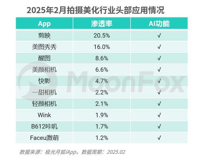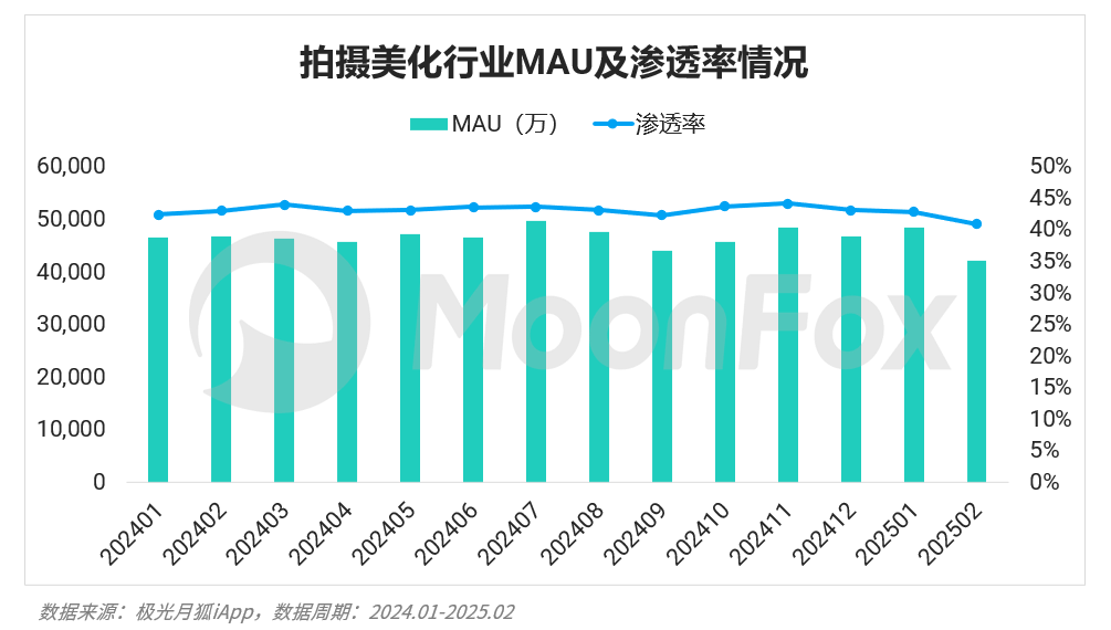 国内拍摄美化市场已进入成熟期,据极光月狐iApp数据显示,近一年来,移动互联网拍摄美化行业月活跃用户规模在4.5亿水平上浮动,渗透率维持在40%以上,从曲线走势来看,行业的用户规模未见明显上扬的增长趋势,市场格局逐渐稳定,而竞争的焦点从单纯的用户争夺转向了如何通过技术创新提升用户体验、拓展服务边界以及优化商业模式,以实现可持续的增长与突破。