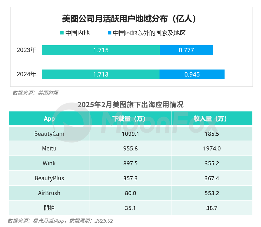 在整体行业用户规模增长放缓的国内市场之外,全球化已成为美图撬动新增量的核心战略。截至2024年12月,中国内地以外的国家及地区平均月活跃用户为9451万,占整体MAU的36%,同比增加了21.7%,这一增速远超国内市场用户的自然增长,同期内地MAU略微下降了0.1%。