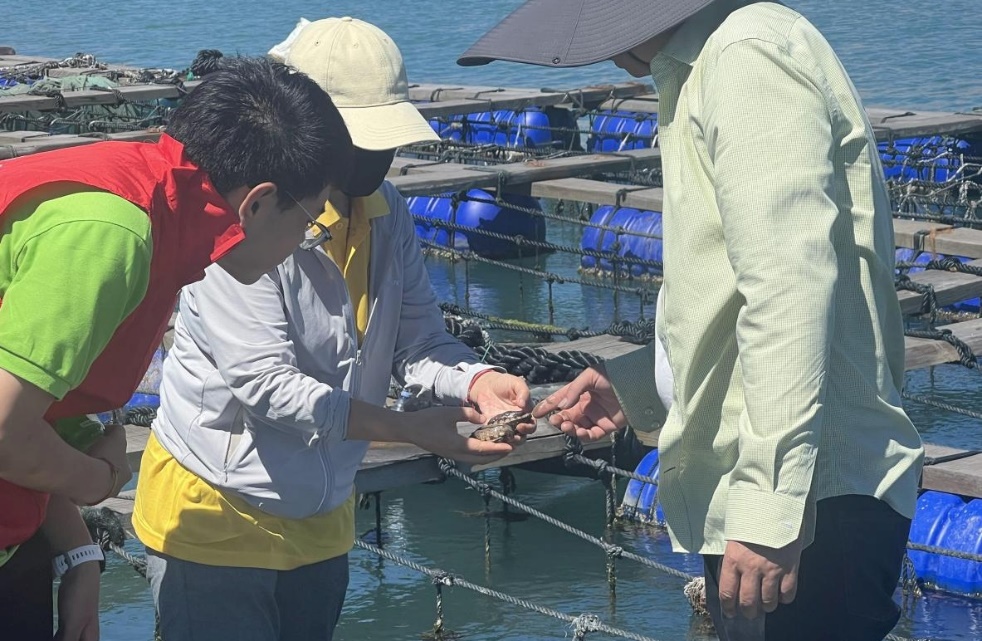 (实践团成员在渔排上看鲍鱼情况 傅钰钦摄)