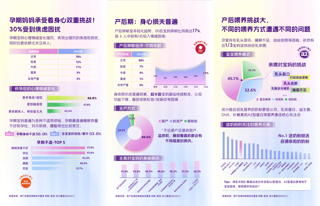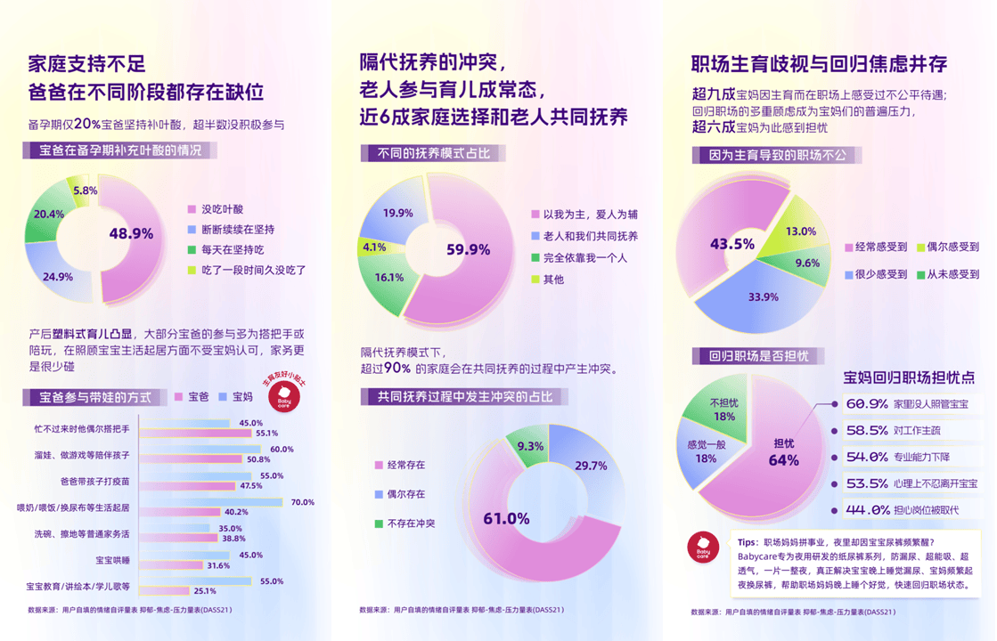 同时,白皮书指出,压力从备孕阶段便已开始。超过三分之一的宝妈在备孕期间承受着来自工作冲突、亲友过度关心及知识获取不足等方面的压力。进入孕期,母亲们身心挑战加剧,约30%的宝妈存在焦虑情绪,睡眠质量下降、孕吐、尿频等身体不适极为普遍。分娩后,问题进一步凸显:产后抑郁呈现年轻化趋势,00后宝妈中抑郁比例高达17%;身体损伤同样普遍,超半数母亲面临持续脱发、腹部松弛及妊娠纹等困扰。此外,家庭支持不足成为核心痛点,父亲在备孕、喂养、日常照料及家务劳动中参与度明显偏低,“塑料式育儿”现象普遍,且近六成家庭依赖隔代抚养,超90%的家庭在共同抚养过程中存在冲突。