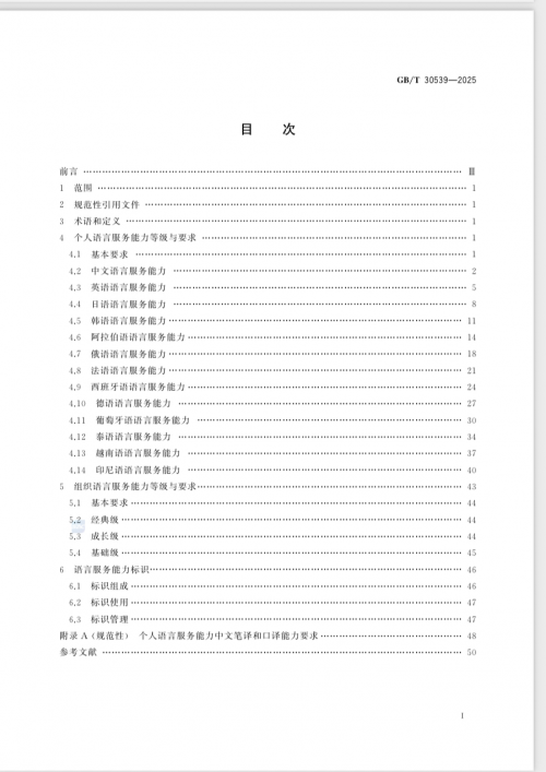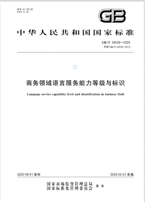 近日,我国首部聚焦商务领域语言服务的国家标准《GB/T 30539-2025 商务领域语言服务能力等级与标识》(以下简称《语言服务国标》)正式发布,并将于 2026 年 2 月 1 日起全面实施。该标准由国家市场监督管理总局、国家标准化管理委员会联合发布,全国电子业务标准化技术委员会(SAC/TC83)归口,标志着我国商务领域语言服务正式进入标准化、规范化发展新阶段。