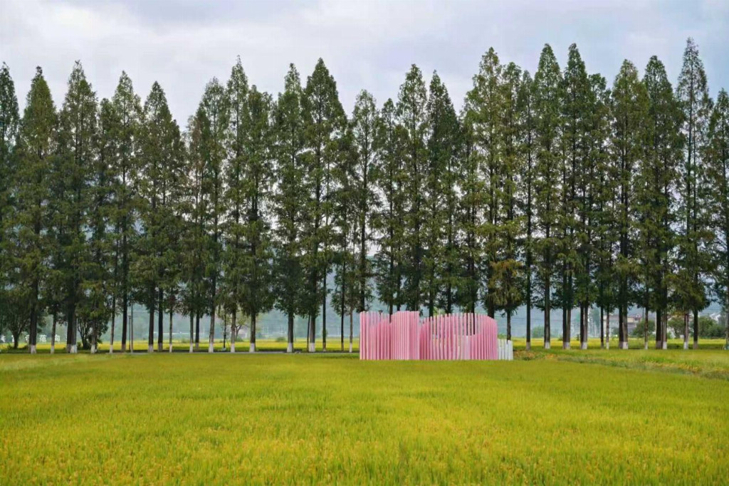 “艺术乡村”代表桐庐县梅蓉村,进村之路水杉成行,仿佛进入童话森林隧道中,尤其在“竹磬万籁”节点驻足,林间清风、竹音清朗,是拍照打卡的绝佳点位。十大美院的20件艺术装置散千亩稻田间,在这里可参观“漠画肆季”美学馆、体验吉木丘林农场农事,入住梅蓉逸宿,枕江景而眠,如入《富春山居图》实境。