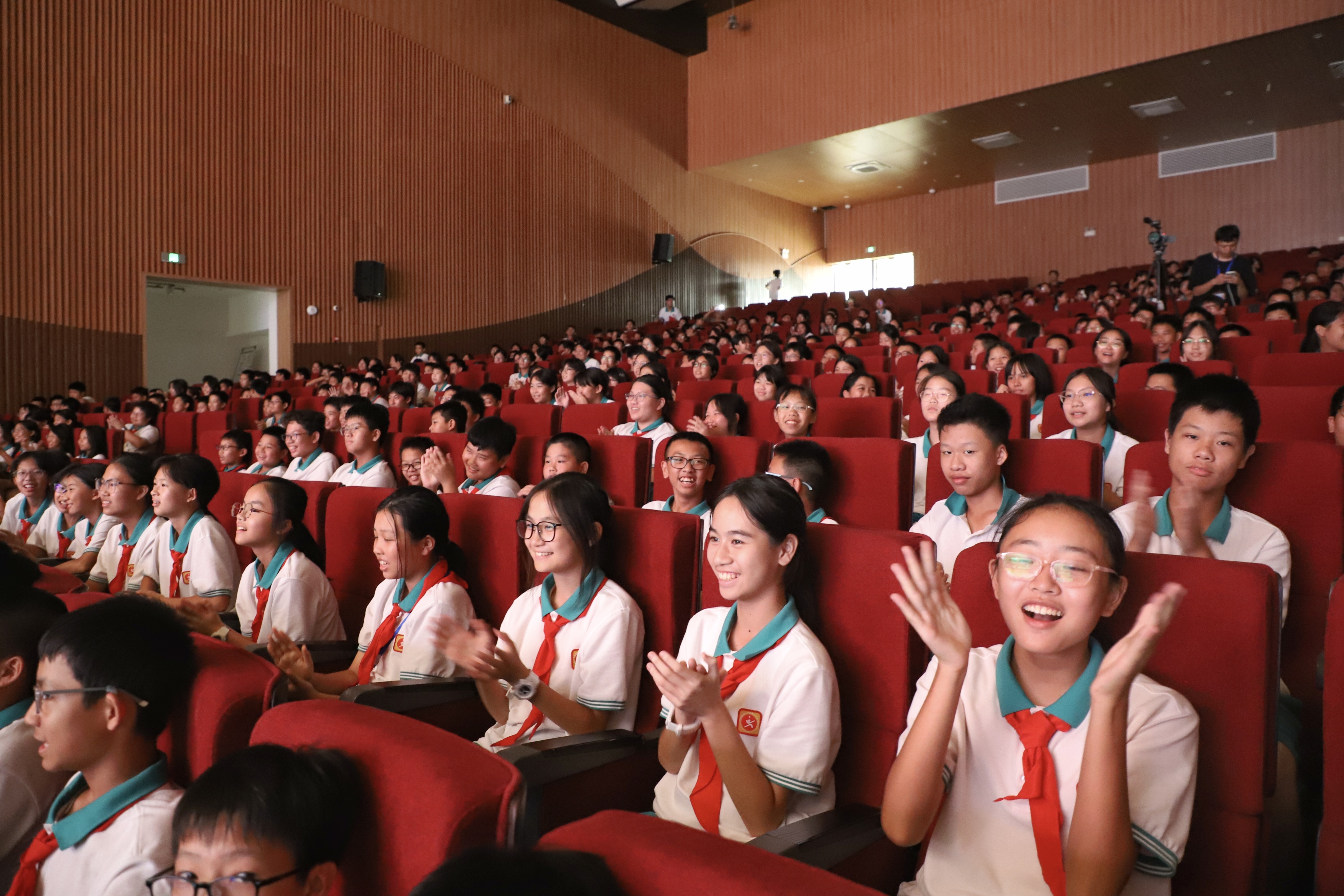 从《旭照山海间》中“永耀金光的海”,到《青砖》里“炮火燃烧的历史”;从《贝壳里的港湾童话》的童真想象,到《南沙潮声里的文化年轮》的深沉思考……朗诵稿以“穿梭时空的旅者”为叙事主线,将孩子们的文字化为声情并茂的舞台艺术,引得台下掌声不断。