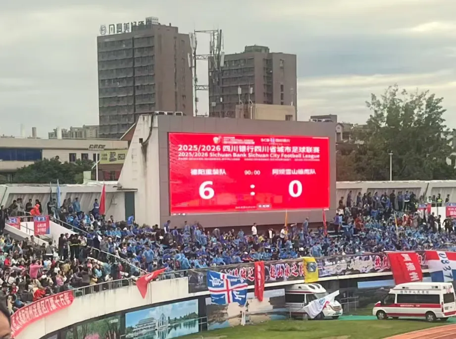 10月12日下午,在广大球迷的呐喊助威声中,德阳重装队在自己的川超联赛首个主场比赛中,以6比0的比分战胜阿坝州雪山雄鹰队,拿下了一场宝贵的胜利。