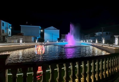 改造的第一步,就是彻底整治这个“老大难”问题。清淤除污、清除杂草、池塘的“脏乱差”源头被一一清除;修建门塘、铺设步道,基础休闲设施逐步升级。如今,昔日令人避之不及的“荒秽塘”已彻底换新:池水清澈见底,岸边整洁有序,新修建的门塘搭配着景观灯光,每到夜幕降临,灯光璀璨闪耀,照亮了乡村的夜晚;新增的温泉喷水表演,水柱随灯光变换姿态,引得村民驻足观赏,欢声笑语不断。