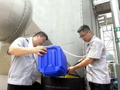 为确保水箱里的储水质量,攻坚小组严格执行一周两次的换水频率。7月的楼顶,太阳炙烤,地表温度超过40℃,包机负责人赵超和团队成员把这项并不轻松的任务执行得一丝不苟。他们需要将设备水箱内的废水彻底排空,再注入新鲜清水,随后精准加入碱液调节水质。每次换水量多达30吨,每换一次需要3小时,汗水浸透了工装紧贴衣背,顺着脸颊流淌,他们未曾有过丝毫懈怠。