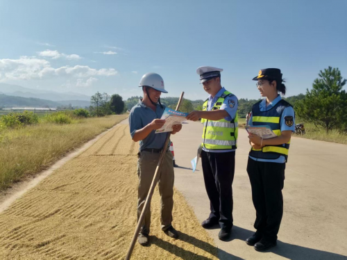 “大叔您好,我们注意到您在公路上晾晒谷子了。这段路的车流量可不小,谷子占用路面后,不仅给车辆通行带来很大不便,还暗藏着安全隐患。麻烦您现在配合把谷子收起来,换到安全的空地上晾晒,谢谢您的理解!”10月11日,连城县交通运输综合执法大队联合县公安局交通管理大队、龙岩高速执法支队连城中队、连城公路事业发展中心及龙三高速交警支队龙岩五大队等多部门,组织志愿者在县道 X659 隔庙线文亨镇路段开展秋季公路打谷晒场专项普法宣传活动。