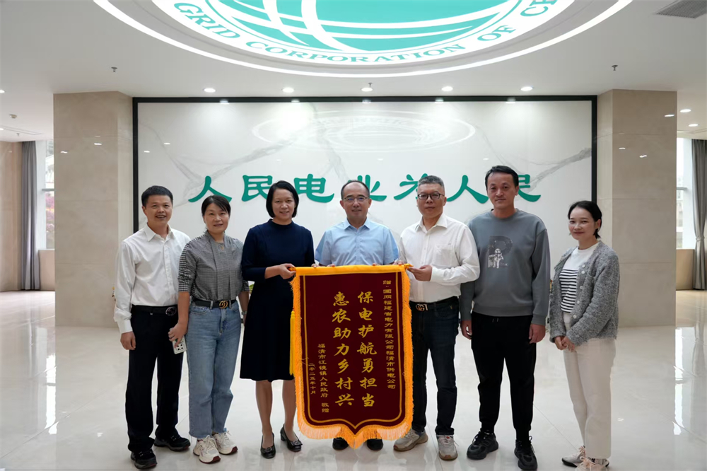 10月24日上午,福清市江镜镇党委书记何美宋带领相关人员将一面写着“保电护航勇担当,惠农助力乡村兴”的锦旗送到国网福清市供电公司负责人手中,对该公司长期以来为江镜镇高标准农田项目,提供可靠电力保障与优质电力服务,表示高度认可与衷心感谢。