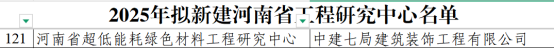 中建七局建装公司中建视窗近日,河南省发改委公布了《2025年拟新建河南省工程研究中心公示》,通过中原区发改委、郑州市发改委两级推荐,经专家评审,中建七局建装公司中建视窗成功入选“河南省超低能耗绿色材料工程研究中心”,荣获省级工程研究中心认定。该中心的成功获批不仅体现了省政府及行业主管部门对中建七局建装公司的科技研发与技术协同创新能力的充分肯定,也标志着中建七局在绿色建造领域的技术积累与科技创新能力方面取得重大突破。