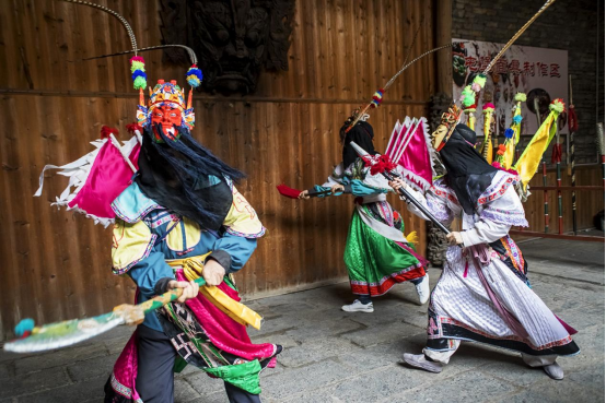 在贵州平坝天龙屯堡,一场《三英战吕布》正在上演。演员们头戴精美木雕面具,腰围彩绣战裙,手持戈矛刀戟,在一锣一鼓伴奏下腾挪转跃。
