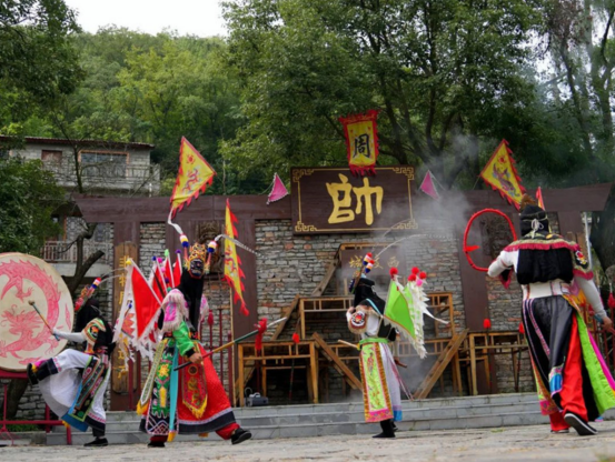 地戏靠锣、鼓两种乐器伴奏,配以弋阳腔,用七言和十言韵文说唱,再结合唱者肢体动作,表现征战格斗打杀。