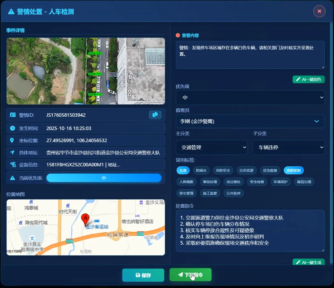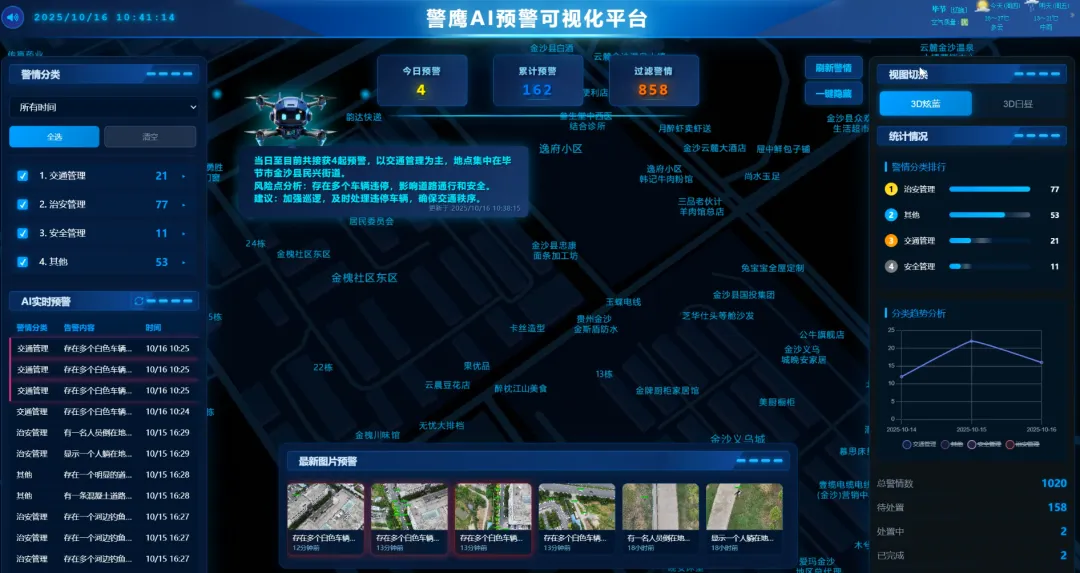 智能警鹰平台创新构建“空中巡查+智慧研判”双架构。前端无人机作为“空中巡查员”,实时识别问题并自动取证;后端AI系统担任“智能指挥官”,深度研判信息、锁定关键画面,通过多渠道第一时间推送值班民警。从空中监测、智能派警到快速处置、规范反馈,形成完整工作闭环,实现警情响应全程高效专业。