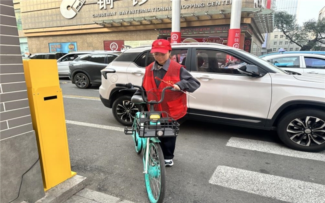 在商圈后街,她认真地将一辆辆乱停乱放的共享单车推至之指定停放区域,并扶正、排列整齐。防止不规范停放的共享单车影响街道上正常机动车的行驶,避免发生剐蹭,阻碍的现象。