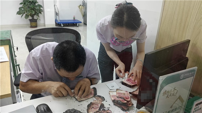 考虑到残币数量较多且损毁严重、粘连紧密、碳化易碎,处理难度极大,该行迅速安排经验丰富的现金柜员为该客户服务,工作人员小心翼翼地将烧毁的人民币一张张分拣开来,仔细对每一张残损币进行拼凑和鉴定,逐一确认可兑换金额。经过细致、专业的清点及鉴定,该行成功为客户兑换了大部分符合规定的残损人民币,最大程度地挽回了客户经济损失。当崭新的钞票交到客户手中,他紧锁的眉头终于舒展开来,连声向银行工作人员道谢。