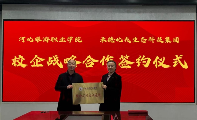 在全体与会人员的共同见证下,双方代表正式签署战略合作协议,并完成了“河北旅游职业学院校外实习实训基地”的授牌。