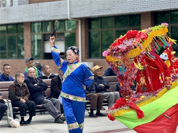 活动当天,鲁溪镇敬老院洋溢着浓厚的节日氛围。老人们早早坐在建筑前的长椅与凳子上,身着轻便衣衫,头发梳得整整齐齐,脸上带着期待的笑容,目光紧紧望向即将开始的表演区域。随着音乐声响起,慰问演出正式拉开帷幕。表演节奏欢快,引得现场老人们目不转睛——有的微微前倾身子,有的嘴角挂着笑意,眼神里满是沉浸与欢喜。现场氛围温馨又热闹,欢呼声、掌声与喜庆的音乐声交织在一起,让秋日的敬老院暖意融融。
