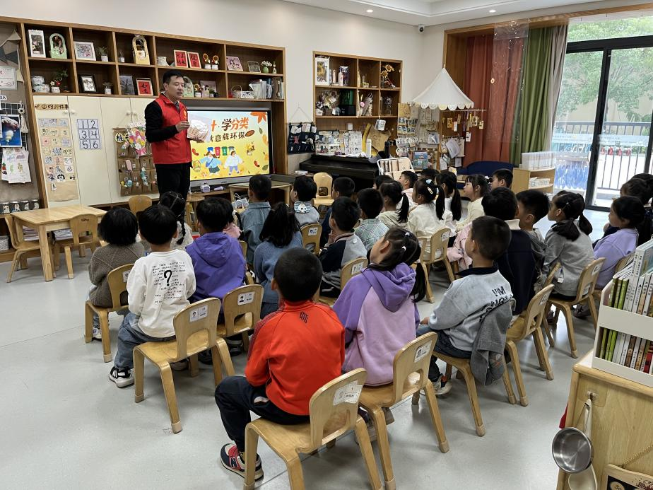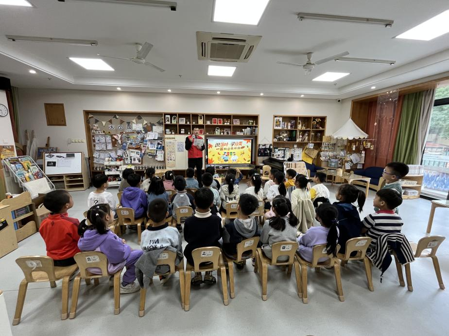 “小朋友们,这些掉落的树叶属于什么垃圾呢?”志愿者通过提问互动,引发孩子们的好奇心。随后,结合秋季落叶的特点,志愿者详细科普了落叶属于易腐垃圾,以及落叶回收利用的多种方式,让孩子们初步建立了“垃圾是放错地方的资源”的环保理念。