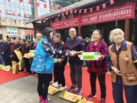 邛崃市竹溪物业管理有限公司支部委员会的工作人员为75岁以上的老人们逐一送上了大米和卫生纸等物资,每一份物资都满载着社区与爱心企业对老年群体的深切关怀。许多老人在接过物资时连声道谢,纷纷表示“感受到了家的温暖”。随后,坝坝宴分场次有序进行。
