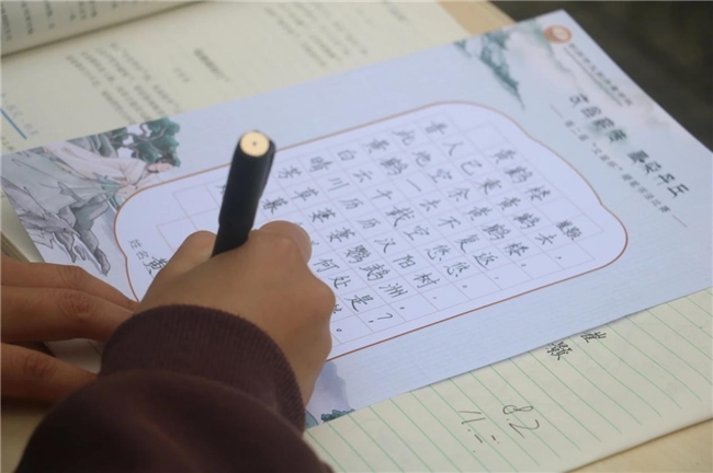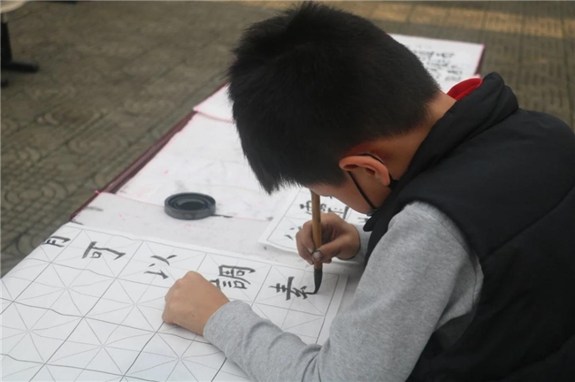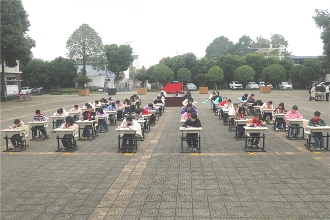 此次比赛分为绘画和书法两项内容,其中书法比赛现场进行。比赛现场,参赛桌椅整齐排列,硬笔书法纸、砚台、毛笔、宣纸等工具早早备好,浓郁的传统文化氛围扑面而来。随着易主任宣布比赛开始,同学们迅速进入状态:有的屏息凝神,先在草稿纸上反复斟酌笔画结构;有的胸有成竹,提笔蘸墨后果断落纸。现场只听得见笔尖划过纸张的“沙沙”声,以及偶尔传来的轻微蘸墨声,每一位同学都沉浸在书法创作的世界里,专注而认真的模样,成为操场最动人的风景。