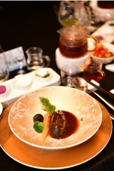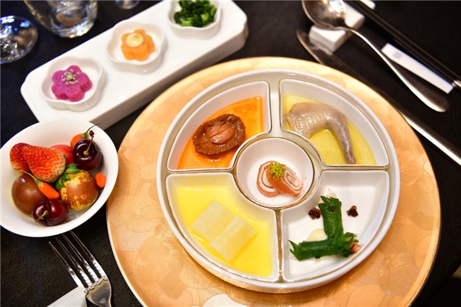 本次品鉴会的核心是由南京富力万达嘉华酒店行政总厨曹勇团队精心设计的“冬藏”主题菜单,严格遵循淮扬菜“和、精、清、新”理念,并巧妙融入当归、石斛、黄芪等多种中药材,分为五个篇章。