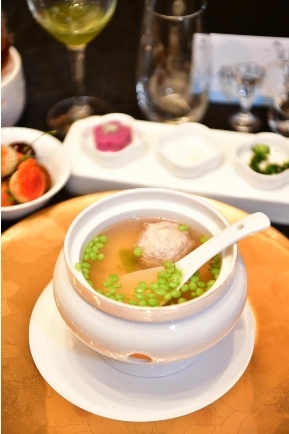 第三篇章:冬·品 的代表 土茯苓手剥河虾狮子头,将土茯苓的微甘淡味融入清汤,搭配手剥河虾的鲜甜,体现了健脾祛湿、滋补不留燥的淮扬精髓。
