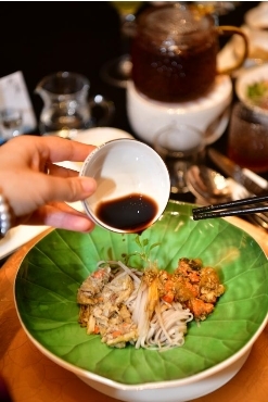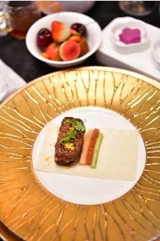 第二篇章:冬·意 由三道调味菜与五道冷菜组成。芝士蜜薯、炝萝卜樱与黄芪盐水鸽腿、柠汁鲜天麻等菜品交织,共同实现健脾开胃、平衡阴阳的“预处理”目的。