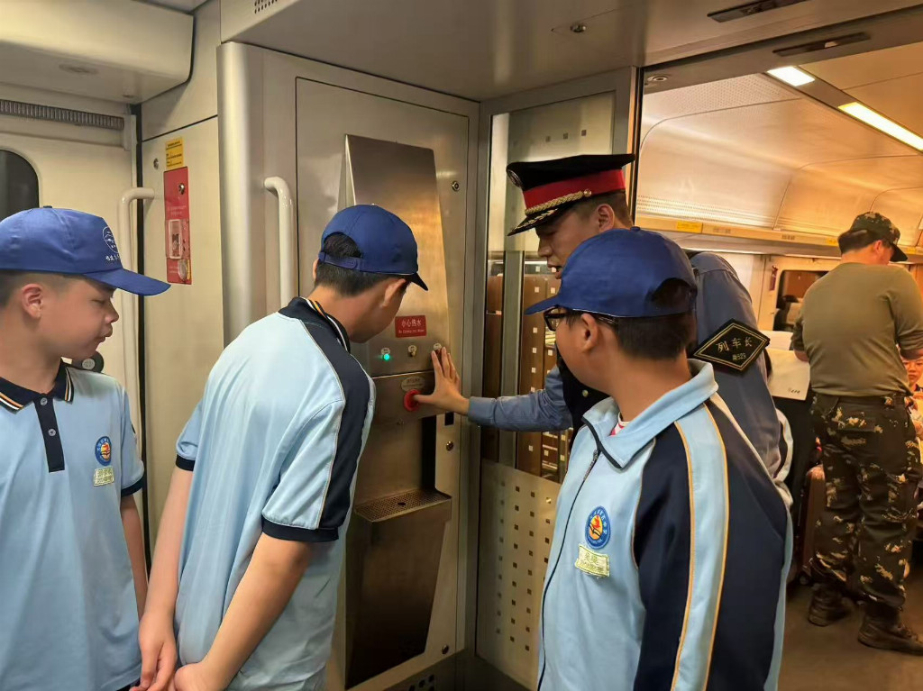工作人员结合真实的列车环境,化身“临时讲师”,开展了一场别开生面的现场教学。他们系统地引导师生们认识和掌握车内各类设备设施的位置与使用方法,并重点讲解了灭火器等消防器材的操作规范与消防安全知识。原本可能枯燥的说明书条文,在工作人员耐心细致的讲解下,变得直观而易懂。列车平稳运行,为“移动课堂”提供了绝佳环境。