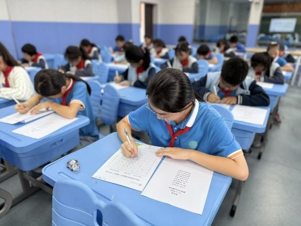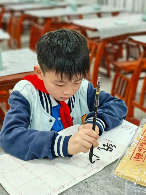 阳光透过明净的窗户,洒在孩子们专注的脸庞上。低年级的小选手们虽笔触稚嫩,却一笔不苟,工整书写着。高年级的同学则气定神闲,在横竖撇捺间展现日渐扎实的功底。