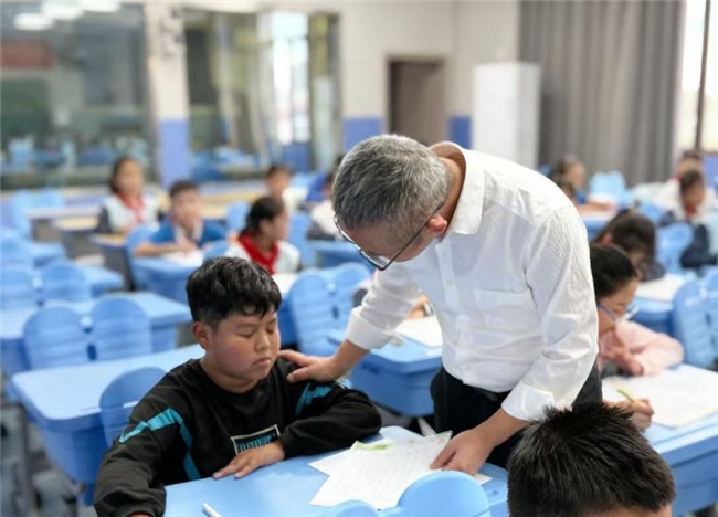 比赛过程中,登高小学党支部书记、校长刘伟义亲临赛场,静静观摩孩子们书写,眼中满是赞许。他走到小选手身边,俯身细看,不时微笑点头。看到特别出色的作品时,他轻声鼓励:“这笔‘捺’写得很有力,继续加油!”“字如其人,你很认真。”