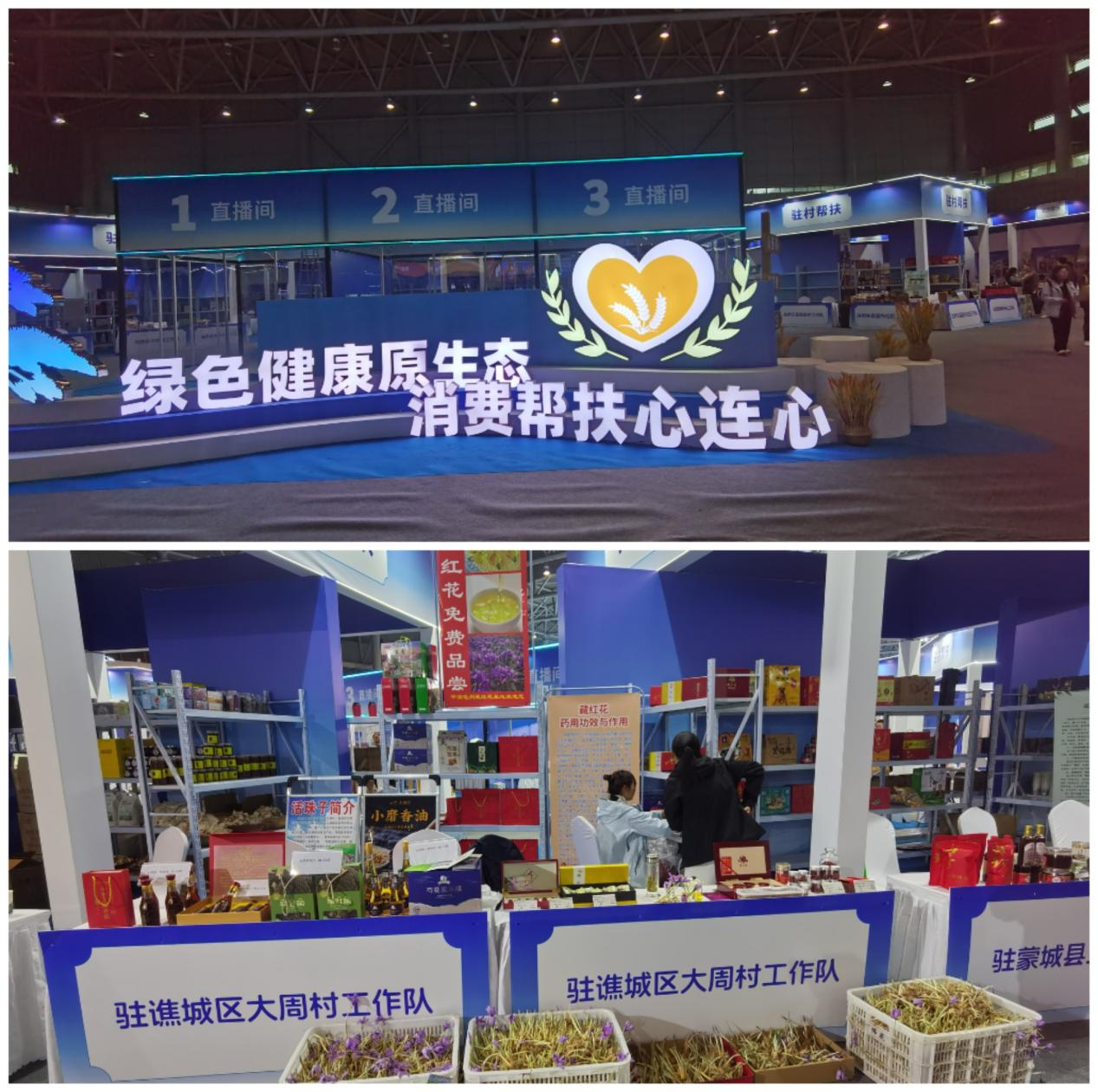 小磨香油、芍花蜜醋、羊肚菌、活珠子钢化蛋、藏红花产成品及花球,来自世界药都亳州本地的特色农产品把展架摆得充充实实、琳琅满目,而且随风飘逸着阵阵藏红花香,沁人心脾,令人愉悦。路过的人群,纷纷停下脚步,询问产品。驻村工作队和农场代表热情解答,促成了一笔笔交易。