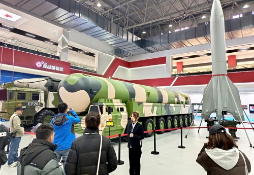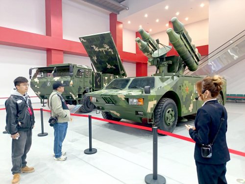 讲解员(右二)在介绍火箭军装备。蔡得军摄