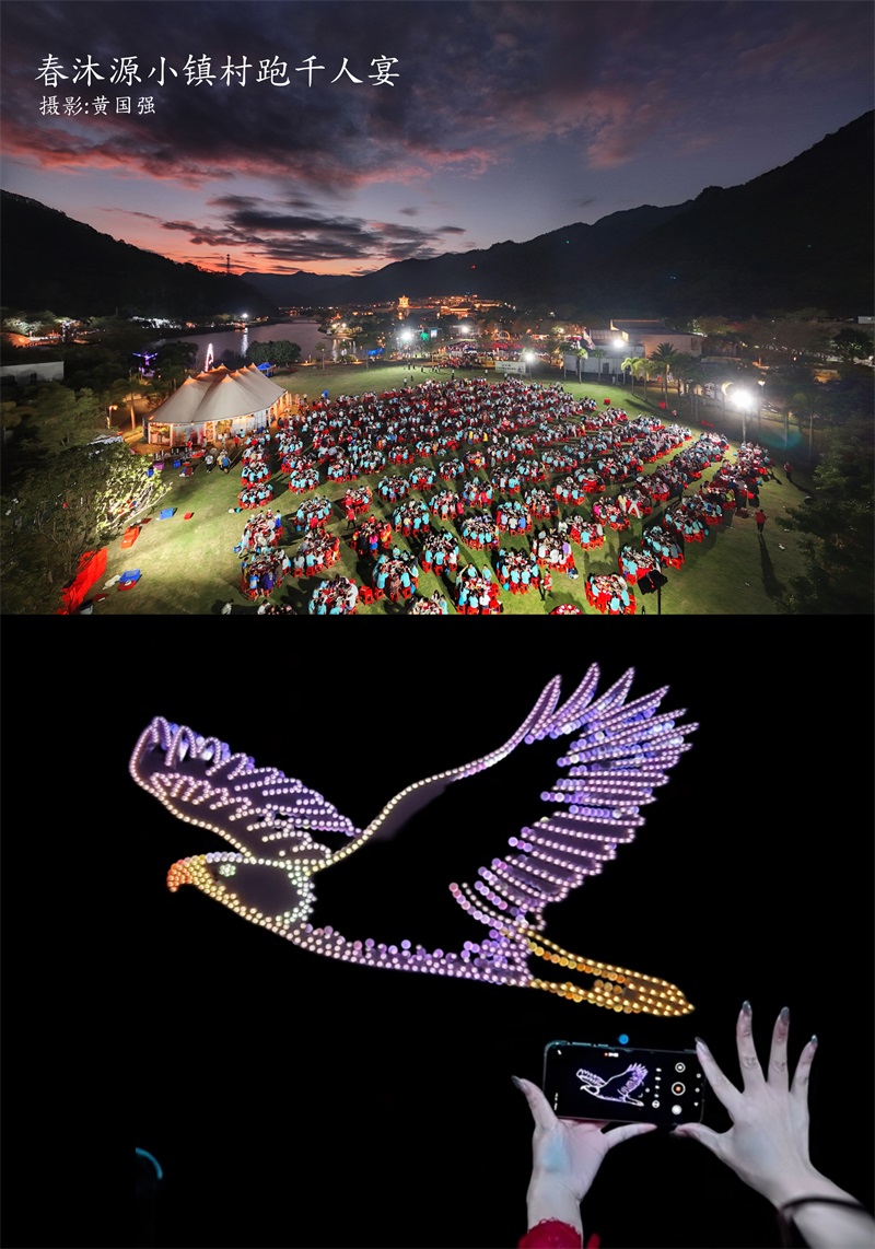 三大核心场景亮点纷呈、赋能多元。赛事前期通过“客上河源”小程序开通报名通道,名额一经推出即被“秒抢”;赛中依托无人机直播、短视频实时推送与省市媒体矩阵联动,构建“赛事引流—消费转化”的即时闭环。客家村宴上,“源城一桌菜”香气四溢,老者鸣锣启宴传递乡土温情;“四季村晚”舞台上,河源职业技术学院师生与各歌舞团轮番登台,客家山歌、传统舞蹈尽显文化自信与青春风采,让乡音乡情燃爆现场;成果展示区里,河源泉益健天然苏打水、埔前魔芋酱等本土农产,与海南糟粕醋等跨域好物同台亮相,爱心企业家与乡村振兴靓播君公益主播热情推介,以消费帮扶助力乡村发展,赢得消费者广泛青睐。夜幕降临,数百架无人机编队变幻出“全国千强镇”“非遗美食 东江盐焗鸡”等主题图案,璀璨烟花与小镇灯光交相辉映,带来震撼视听体验。
