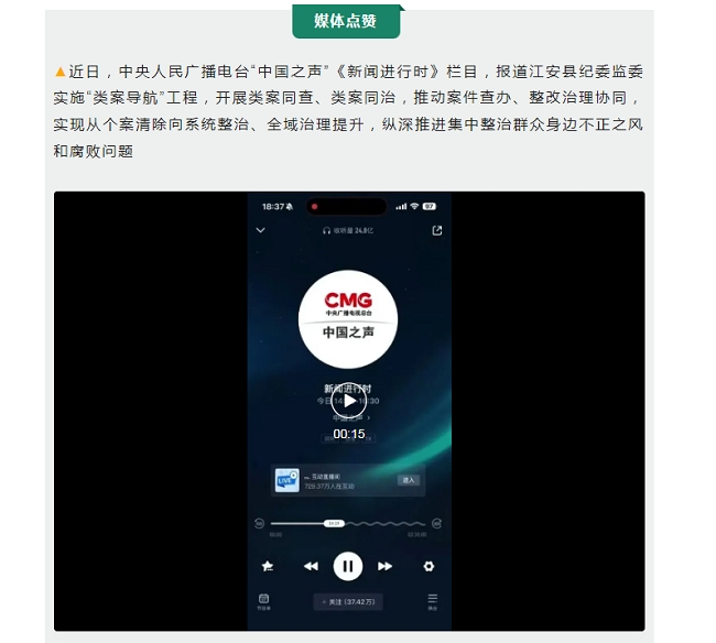 近日,中央人民广播电台“中国之声”《新闻进行时》栏目,报道江安县纪委监委实施“类案导航”工程,开展类案同查、类案同治,推动案件查办、整改治理协同,实现从个案清除向系统整治、全域治理提升,纵深推进集中整治群众身边不正之风和腐败问题。