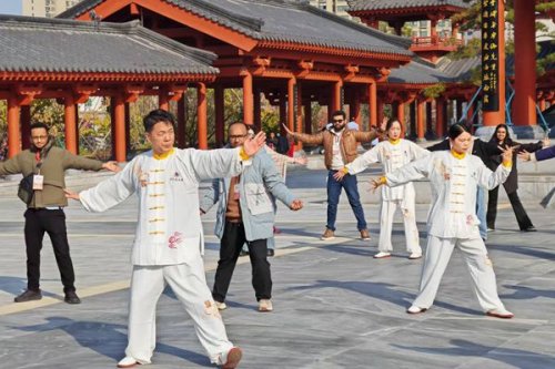 在医圣文化园广场上,伴着音乐徐徐动作的一道道白色身影吸引了外国青年和网络达人的注意。大家情不自禁放下背包,走进队伍,跟练起了吴氏太极易筋功。