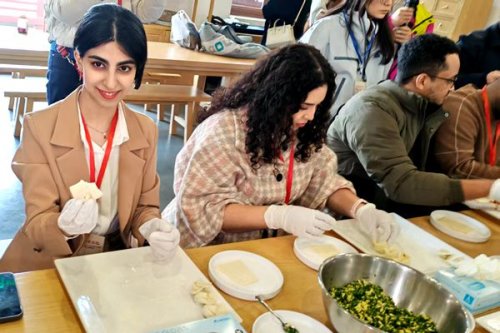 在医圣文化园体验中心,大家仔细聆听老师介绍了饺子的起源和具体做法,一个个外国青年盯着老师的翻飞的手指,慢慢小心的将自己手上的面皮包成一个个圆润的“小元宝”,来自伊朗的坦妮娅第一次体验包饺子,她说,“这饺子的做法真是太有趣味了,我非常享受这个包饺子的过程”。