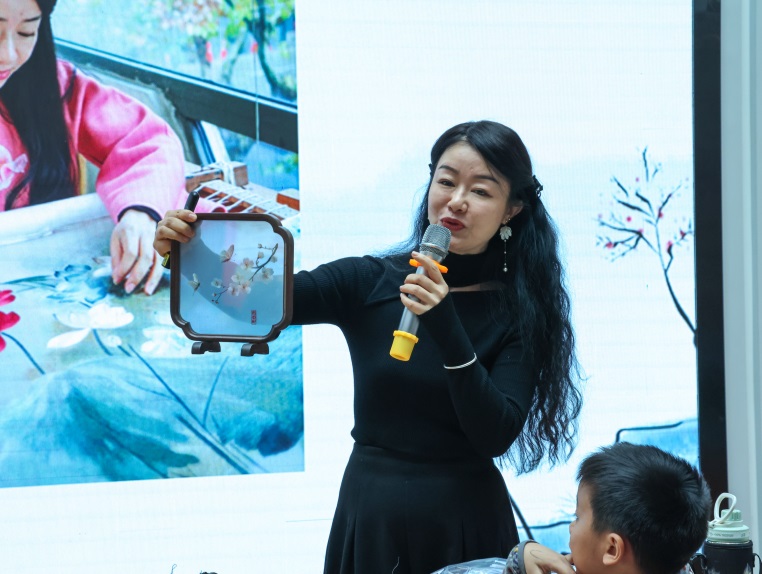 作为杭绣传承人、杭州市工艺美术大师,周秀萍老师的分享自带非遗魅力。她从杭绣的历史讲起,将 “一针一线的专注” 与 “家庭相处的耐心” 巧妙结合:“刺绣时的每一次穿针,就像和家人沟通时的用心倾听;每一次走线的默契,就像家庭协作的合拍。