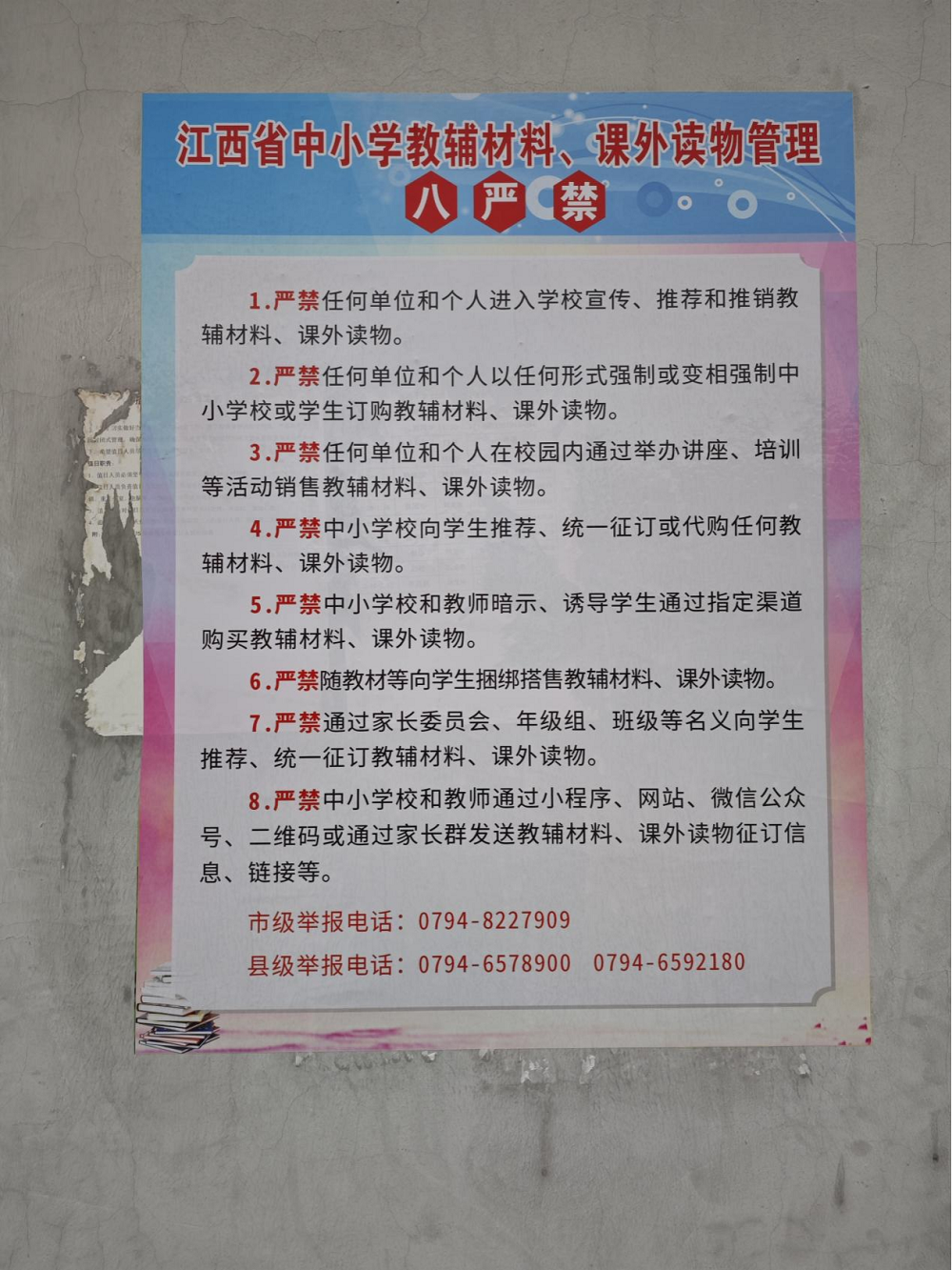 为强化宣传效果,学校在公告栏等醒目位置张贴了“八严禁”具体内容的告示,广泛接受学生和家长的监督。同时,由校党支部牵头,教务处、政教处联合组成专项检查小组,采取不打招呼、随机走班的形式,对学生书包、课桌内的教辅材料进行了突击抽查,重点核查材料的来源与合规性。