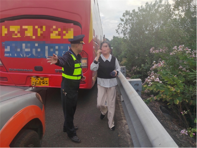漳州高速执法支队四大队平和中队接到平和路勤站通报后,立即启动“5+N”联勤联动应急机制,快速调派两辆执法车赶赴现场处置。执法人员抵达后迅速分工协作,一方面协同路勤严格按照规程设置安全警示区域,利用警示灯和指挥手势引导后方车辆提前减速、有序通行,严防次生事故;另一方面,鉴于户外气温低、旅客长时间滞留存在安全与健康风险,执法人员利用执法车辆分批将滞留旅客转运至最近的高速服务区。