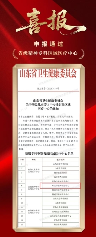 枣庄市精神卫生中心成功入选“省级精神专科区域医疗中心”