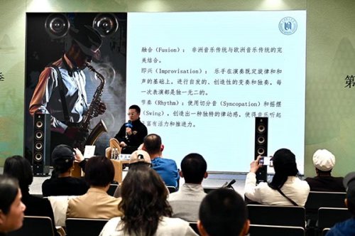 在演讲伊始,李教授介绍了爵士乐的内涵与特征。他表示,爵士最初用于描述棒球手变化莫测的投球技术,后来进入主流文化,特指新颖、有活力的现象,最后被固定指代一种源于美国南部非洲裔群体的音乐类型。爵士乐有融合、即兴、节奏三大特征,混合了非洲节奏传统、欧洲音乐元素、加勒比风格以及美国本土文化,多为现场即兴创作,极具活力与煽动性,展现了被奴役的非洲裔以音乐的方式“呐喊自由”的本质。