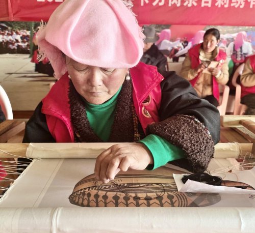 活动现场,卡力岗村新时代文明实践站褪去了往日的闲谈喧闹,取而代之的是专注与静谧。空气中弥漫着丝线的清香,银发老者与青年后辈围坐一起,绷架稳稳托住素色棉布,五彩丝线随着银针灵巧穿梭,时而细细勾勒,时而款款游走,在布面上渐渐晕染出灵动雏形。这并非一场普通的兴趣交流,而是承载着藏绣文化根脉的非遗传承盛宴,古老技艺在朝夕切磋、邻里互学中悄然薪火相传。