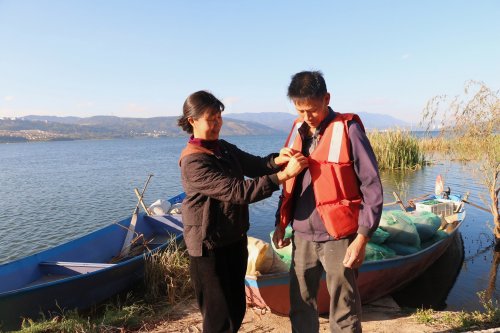 图为一渔民妻子送丈夫出船捕捞银鱼,为他检查救生衣等安全用具。