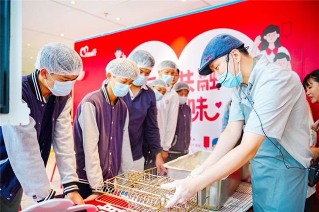 在“美味实践・互动体验” 环节,天使员工展飞是此次实践教学的核心导师之一。他不仅在肯德基深耕十年,更是珠海特殊教育学校的第一届毕业生。从初入职场时的青涩生疏,到如今对各类繁琐复杂的工作内容熟稔于心、信手拈来,展飞用流畅的裹粉操作、细致入微的步骤讲解,为学弟学妹们上了一堂生动鲜活的职业实践课。