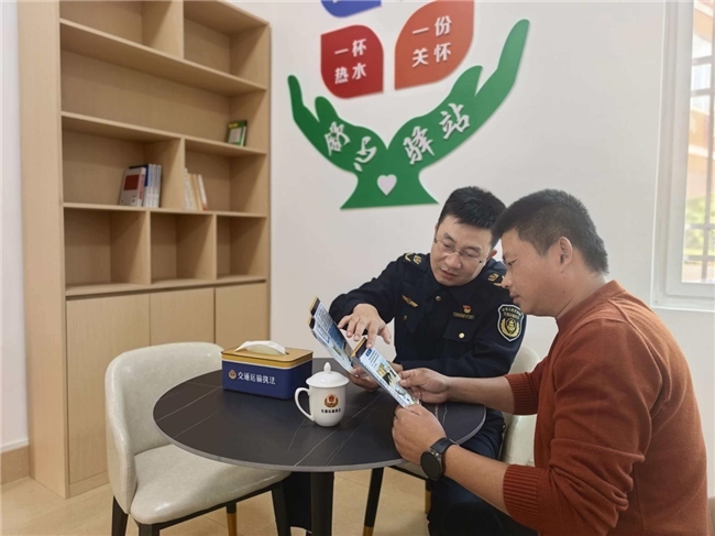 事后,执法人员主动邀请企业负责人及驾驶员至中队“司机之友”休息区,开展针对性普法交流。围绕大件运输许可办理、不同路段限宽标准、夜间行车安全、突发情况规范处置等内容进行讲解,并结合常见运输误区进行提示。交流中,执法人员认真听取驾驶员关于货运通行的意见建议,详细记录诉求。“这些知识非常实用,跑大件运输就怕遇到问题无处咨询,你们是真心为我们着想。”驾驶员在交流后感慨道。