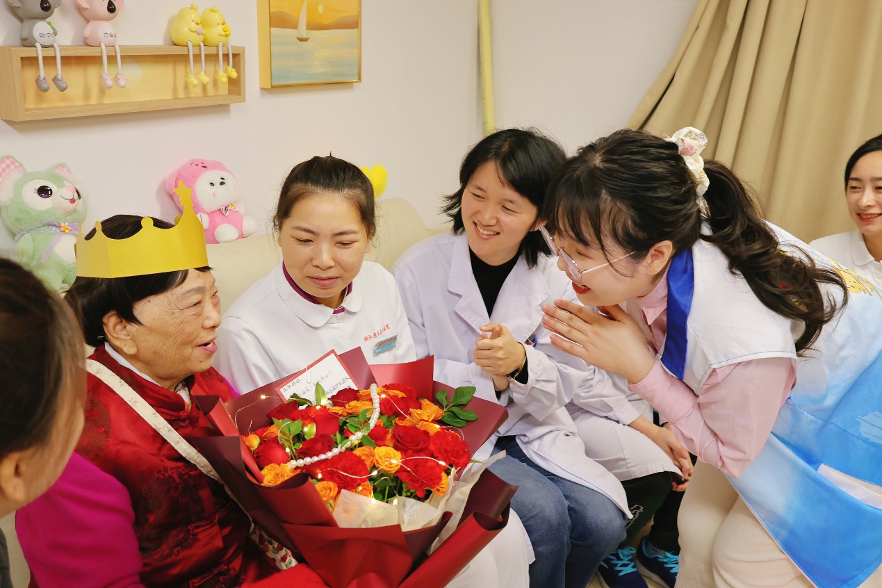 在浙江老年关怀医院安宁疗护病区的宸馨室,一场温馨的生日会温暖上演。73岁的张奶奶(化名)头戴生日帽,面前摆放着寿桃包与红玫瑰装点的庆生桌,身边围绕着她特邀的院内好友、医护人员,以及长期陪伴她的“安宁·墅之愿”医务社工与志愿者们。