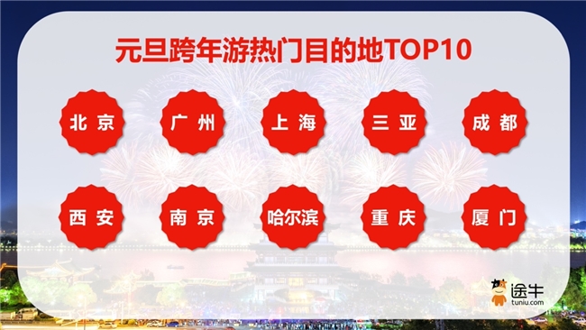 跨年游热门目的地方面,北京、广州、上海、三亚、成都、西安、南京、哈尔滨、重庆、厦门等备受游客青睐,兼具文化韵味与潮流氛围的城市地标成为跨年游用户的热门选择。