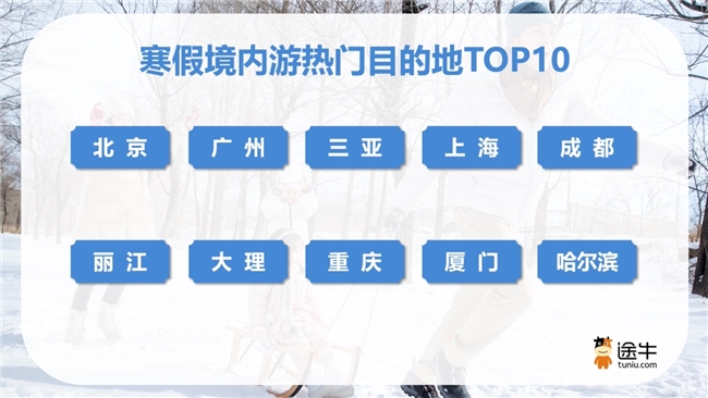 寒假境内游方面,北京、广州、三亚、上海、成都、丽江、大理、重庆、厦门、哈尔滨等目的地截至目前预订热度领先。冰雪旅游、主题乐园、传统文化体验等深受游客青睐。