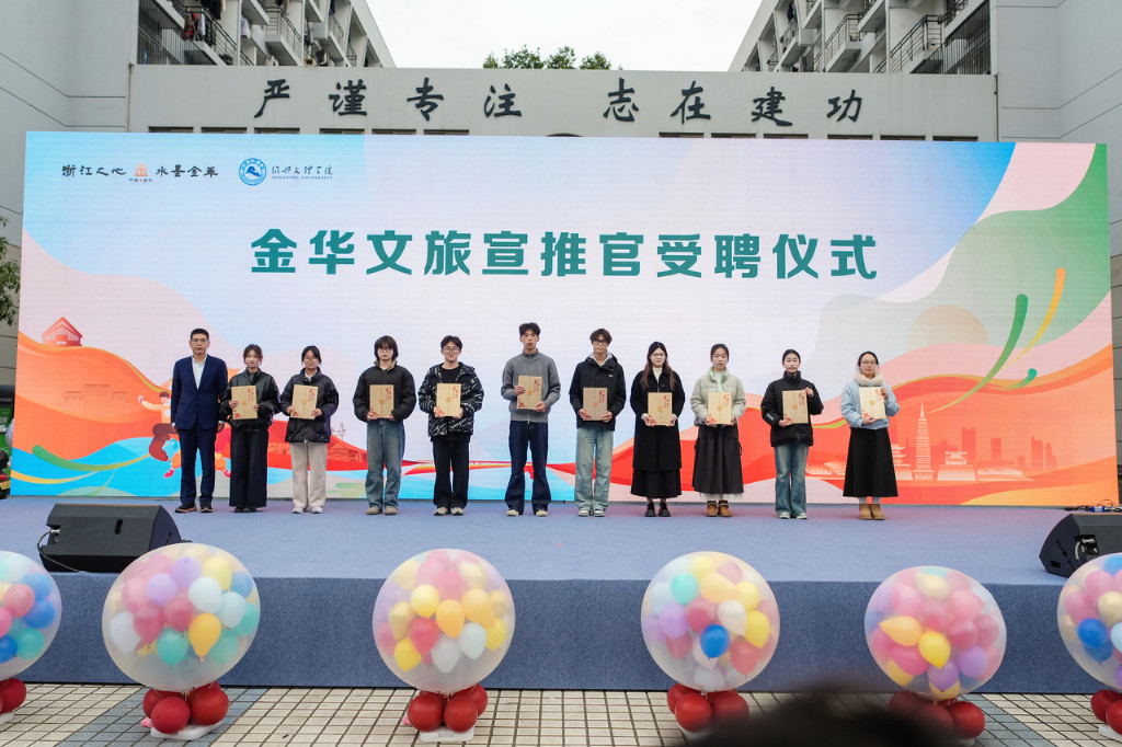 绍兴与金华,同为国家级历史文化名城和中国优秀旅游城市,地缘相近,人缘相亲。当天,10位金华籍绍兴文理学院学子走上舞台,他们多了一重光荣身份——连接两座古城的青春使者,受聘成为金华文旅宣推官,将家乡的美景美食文化介绍给大家。这同时拉开了“青春旅行家打卡金华计划”的序幕。为了邀请更多同学走进金华并参与到旅行分享活动中,金华文旅还将在微信公众号 、微博、抖音和小红书平台发起“青春旅行家打卡金华计划”,届时金华文旅将不定期进行惊喜派送,活动详细资讯可通过金华文旅微信公众号获取。