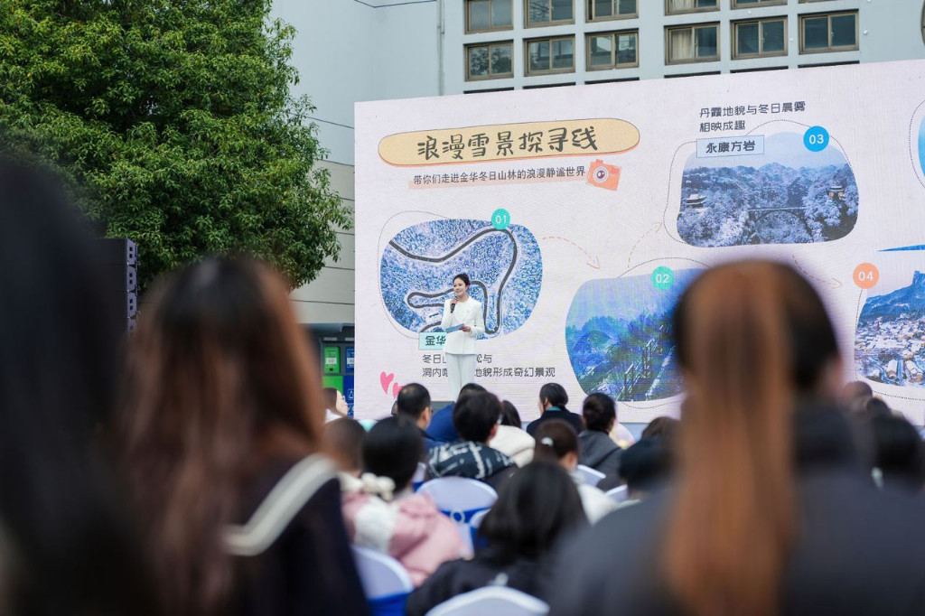 来自金华各县(市、区)文化旅游部门的推介官,现场向绍兴文旅学院的学子们,“吆喝”起独具特色的文化旅游路线——到婺城,感受仙山婺水,婺学风骨;在金义新区,感受艾青诗歌,施光南音乐魅力;到兰溪,探山水岩溶趣味,赏风情民俗风味;在东阳,品木雕之城,到横店光影入戏;到义乌,逛国际商贸城,感受商旅文化;在永康,访山水灵秀,听五金交响;到浦江,打卡上山文化,品味诗画浦江;在武义,泡养生温泉,品山水人文;在磐安,吃养生药膳,感受山居美好;到金华开发区,拥抱九峰胜景,体会山水乡愁……金华各县(市、区)在此“各显神通”,将最美的风景、最潮的玩法介绍给师生们,还送上了福利礼包,盛情邀请同学们在寒假里走进金华。近年来,金华文旅不断创新升级,推出系列新场景新业态新产品,广邀四海游客来金华赏美景、品美食、逛潮市,购美物,共享八婺大地欣欣向荣、全域旅游百花齐放的盎然景象。