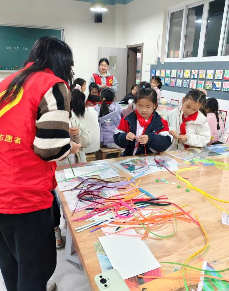 活动一开始,志愿者们并没有急于讲解技法,而是先展示了几件融入传统元素的衍纸成品,瞬间点燃了孩子们的好奇心。随后,负责人用通俗易懂的语言讲述了衍纸的起源、文化寓意与非遗价值。在观看了教学视频后,小朋友都迫不及待的想要上手尝试,志愿者们手把手拆解 “松卷”“泪滴卷”等基础技法,耐心解答孩子们的每一个疑问。